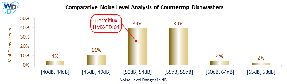 The Hermitlux HMX-TDJ04 operates at 50 dB, fitting into the 50–54 dB range, where 39% of countertop dishwashers are categorized. This makes it an excellent option for users prioritizing quiet operation in their homes.